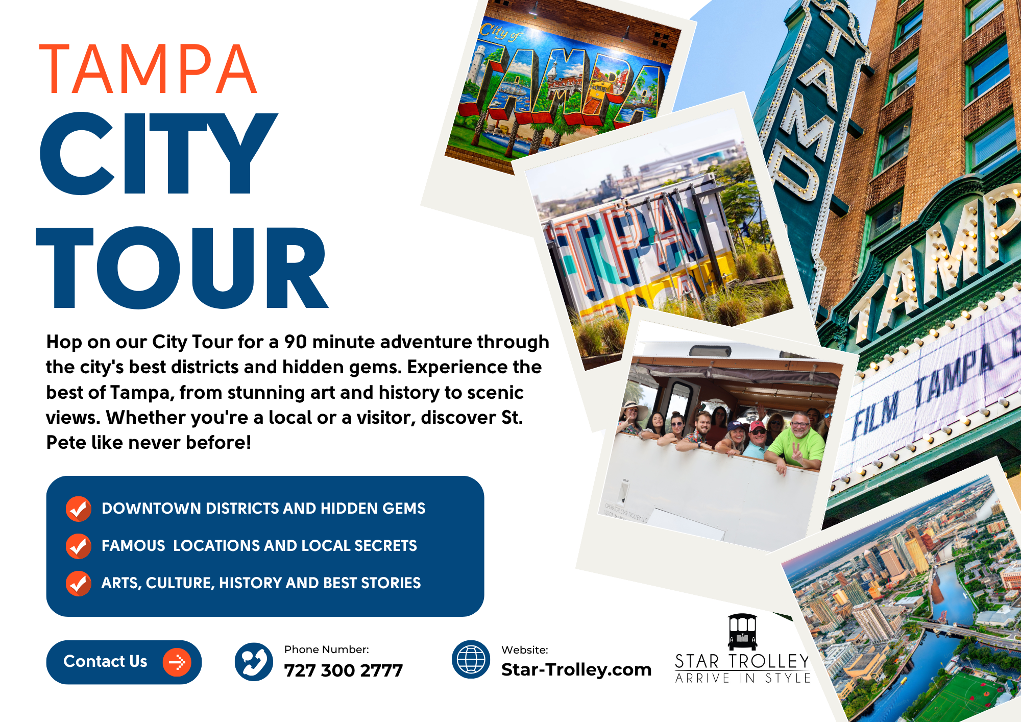 Get ready to fall in love with TAMPA on our electrifying 90-minute Trolley City Tour – your front-row seat to the city’s soul for only $29.99! Zip through vibrant districts, from dazzling murals to historic locations and waterfront stunners.